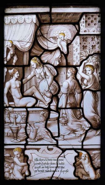 scène mythologique ; vue d'intérieur (Psyché, femme, servante, bain, toilette, parfum, fleur) ; ornementation (angelot)