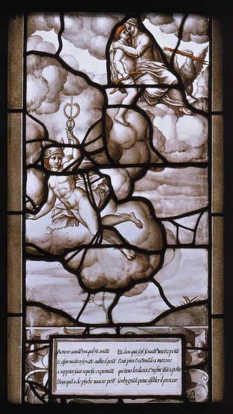 Episode 39 : L'Amour, craignant le ressentiment de sa mère, vient plaider sa cause auprès de Jupiter, qui accepte de faire tout ce qu'il lui demande et lui donne un baiser (partie supérieure du vitrail). Il ordonne aussitôt à Mercure, que l'onreconnaît au centre du vitrail, de convoquer l'assemblée des dieux