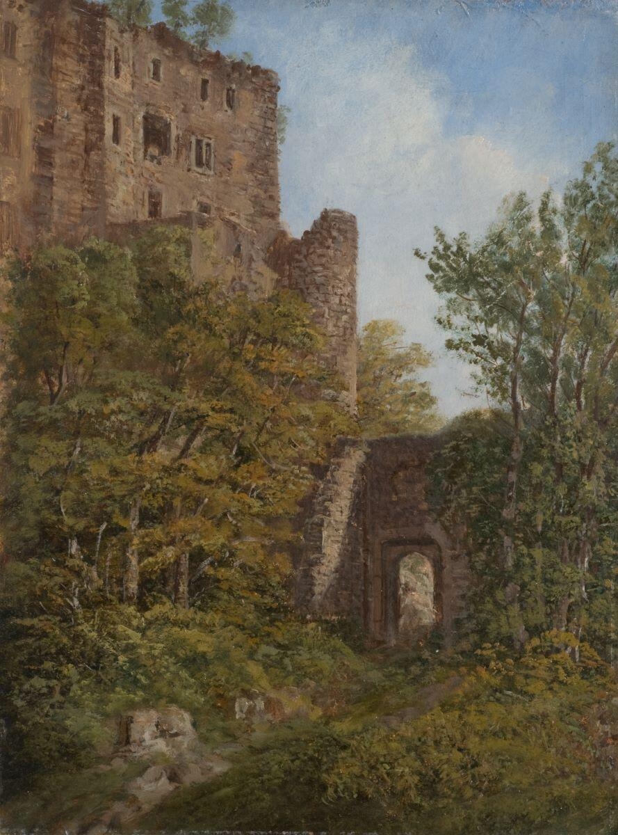 Vue du château du Haut-Koenigsbourg, en ruines et envahi par la végétation, avant la restauration réalisée pendant la première Annexion allemande. A droite, l'entrée principale de l'enceinte ; à l'arrière-plan à gauche, le logis. ; huile sur carton