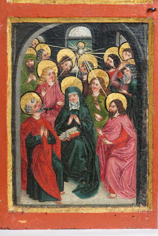 scène biblique (cycle narratif, vie de la Vierge) : scène biblique (Annonciation : Vierge, Ange, Dieu le Père) ; scène biblique (Visitation : Vierge, Elisabeth, Joseph) ; (Présentation au Temple) ; scène biblique (Nativité) - scène biblique (Adoration des Mages) ; scène biblique (Résurrection) - scène biblique (Pentecôte) ; scène biblique (Ascension) - scène biblique (Mort de la Vierge)