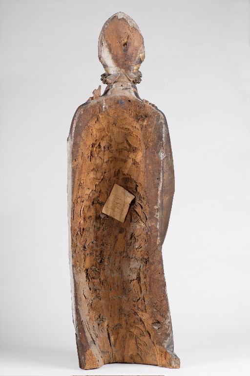 Saint Erasme est représenté debout, en évêque, tenant dans sa main dextre l'instrument de son martyre, un treuil (aujourd'hui cassé), autour duquel furent dévidées ses viscères. ; Bois polychromé