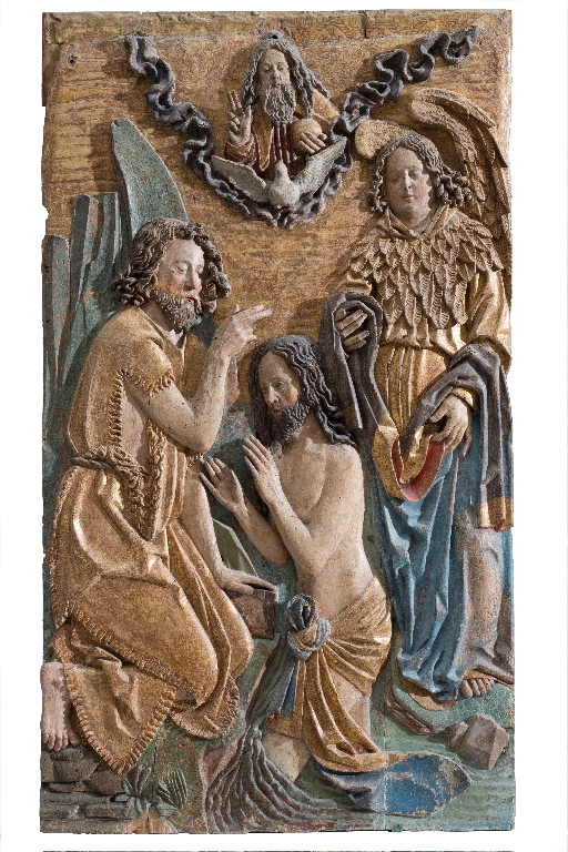 scène biblique (Baptême du Christ, Jean-Baptiste, ange, Dieu le Père, colombe Saint-Esprit)