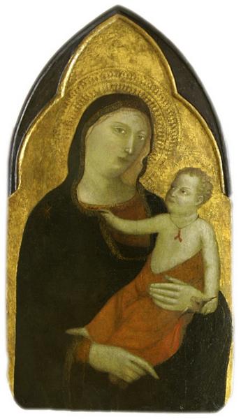Ce panneau devait former la partie centrale d'un triptyque ou d'un polyptyque destiné à la dévotion, les stylisations sont d'inspiration byzantine évidentes - la jonction du nez en forme de ' fourche ' et les mains en ' fourchette ' - dénotant encore l'influence de Cimabue (v. 1240-av. juillet 1302).