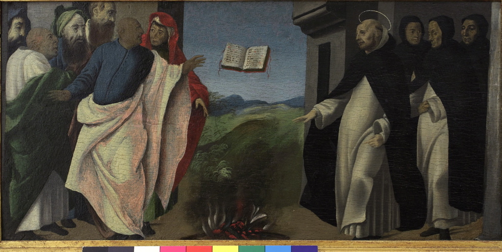 Les deux panneaux de la prédelle illustrent deux épisodes miraculeux de la vie de saint Dominique (1170-1221), fondateur de l’ordre des frères prêcheurs, appelés également dominicains. Dominique de Guzman naquit en Espagne d’une famille noble, prêchant contre l’hérésie, il déploya son activité auprès des Albigeois en essayant de les ramener par la persuasion dans le giron de l’Église. Dès la fin de 1206, Dominique fonde un couvent de femmes à Prouille, dans le sud de la France. En 1216, le chapitre du nouvel ordre donne à Dominique le titre de « prieur et maître des prêcheurs ». Le costume est alors adopté : robe et scapulaire à capuchon blanc, surplis de lin et chape noire ; les frères adoptent la tonsure cléricale. Dominique meurt le 6 août de la même année et est enterré dans l’église Saint-Nicolas de Bologne. Il sera canonisé par le pape Grégoire IX en 1234. Lors de la lutte contre les Albigeois, Dominique part en guerre contre les hérétiques. À Toulouse, il convertit son hôte par l’épreuve du feu : les livres des Albigeois brûlent, le sien plane au-dessus des flammes, malgré des efforts répétés pour le consumer. Les Albigeois possédaient un certain livre dans lequel étaient inscrites les doctrines de leur secte ; Dominique en rédigea un autre pour y répondre. On convint alors de jeter ces deux livres au feu, devant le peuple assemblé. Le livre des hérétiques se consuma aussitôt ; celui de Dominique vola en l'air et alla se poser sur un relais. Trois fois, les hérétiques opiniâtres s'obstinèrent à jeter le livre du saint dans le feu ; mais trois fois il en sortit sans dommage.