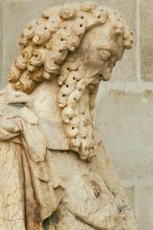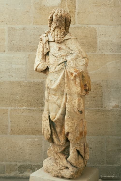 En s’appuyant sur l’observation de modèles proches (mèches torsadées, drapés profondément creusés, etc.), il convient de placer cette sculpture au début du xve siècle. Cette proposition de datation est dès lors à rapprocher d’un événement historique survenu à Libourne en 1427. Cette année-là, un tremblement de terre secoua la ville, endommageant l’église Saint-Jean-Baptiste et son clocher. Quatre ans plus tard, le nouvel archevêque de Bordeaux, Pey Berland (v.1370-1458) – dont on sait qu’il encourageait les décors des édifices du diocèse –, se rendit à Libourne (1431), sans doute pour consacrer les travaux de l’église. Le Baptiste bénéficia-t-il de sa générosité ? Les archives sont hélas muettes, comme elles le sont également au sujet de la date à laquelle il fut désolidarisé du portail. De son côté, la restauratrice Tiziana Mazzoni confirme que la sculpture a été exposée aux agressions pluviales et thermiques, sur un temps long, certainement supérieur à un siècle. Il est aussi possible d’imaginer que, faute d’entretien, le Saint Jean, usé par les intempéries, ait fini par choir de lui-même, dans l’indifférence totale. Mais il est aussi vraisemblable que le vandalisme – guerres de religions - ait pu être responsable de sa mutilation. Quoi qu’il en soit, par son style, sa taille et l’albâtre dans lequel elle est sculptée, probablement d’origine espagnole, la sculpture reste remarquable. Tombée au sol, mutilée, la statue fut remisée derrière un vieil autel des fonts baptismaux avant que d’être retrouvée en 1845, lors des travaux de reconstruction de l’église. Elle fut cédée au musée qui, à son tour, l’oublia… jusqu’à ce qu’elle réapparaisse dans les années 1930. De nouveau oubliée, elle fut retrouvée dans les années 2000. La restauration de la sculpture a permis de révéler des traces de polychromie : or dans les boucles de cheveux et de la barbe, rose sur le visage, bleu-vert et rouge pour le vêtement. Preuve est donc faite que l’église Saint-Jean-Baptiste avait sa façade peinte durant la période gothique. Le visage de Jean-Baptiste, traité dans un souci de réalisme, s’impose à son tour comme un véritable portrait. Barbes et moustaches sont parfaitement symétriques et percées au trépan. Les yeux sont plutôt globuleux et les pommettes hautes et saillantes. Le saint est représenté frontalement, vêtu d’une peau de chameau, attribut érémitique bien visible sur l’épaule droite. Dans sa main gauche, il portait très probablement l’agneau christique. Mais l’animal a disparu, comme les mains et pieds du saint. Cette sculpture du gothique international montre que des pérégrinations incessantes, durant tout le Moyen Âge, ont pu faciliter la circulation des idées, des hommes et des formes. On pourrait tenter de l’attribuer à l’entourage du sculpteur Guillem Sagrera (1397 – 1454), décorateur de la Porte du Mirador de la cathédrale saint Jean de Palma de Majorque (1422). C’est donc une convergence de données culturelles, appropriées au mysticisme chrétien, qui est attestée à travers notre sculpture. On peut aussi établir des comparaisons stylistiques avec les sculptures du portail occidental de l'église Saint Pierre de Bordeaux (vers 1420-1430). On peut comparer notamment le traitement des yeux, ainsi que celui des barbes et des cheveux à boucles serrées, munies d'un trou de trépan au centre. On peut aussi comparer l'oeuvre de Libourne avec les sculptures des clefs pendantes de la chapelle Notre-Dame de la Rose de Saint-Seurin de Bordeaux (1427-1444), également en albâtre. Il pourrait alors s'agir de sculpteurs français, voire même peut-être bordelais, car on ne retrouve pas ce style ailleurs en France.
