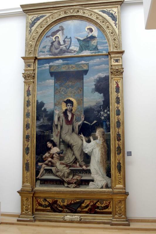 figure (sainte Cécile de Rome, femme, assis, trône, rayons lumineux, mandoline, livre, enfant, fleur, architecture, paysage)