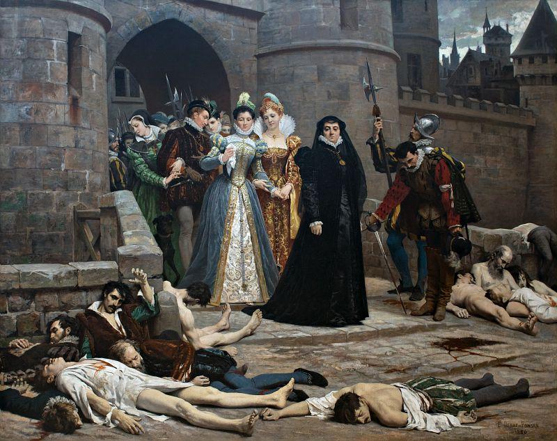 scène historique (Paris, Guerres de religion : La Saint-Barthélémy, massacre, cadavre, protestantisme, sang, soldat, arme, noblesse, reine : Catherine de Médicis, architecture, porte, tour)
