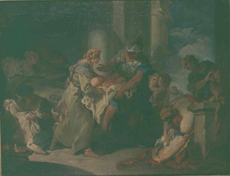 A l'intérieur d'une architecture, une femme tend un nouveau-né entouré d'un linge à un soldat. En 317 avant J.C, alors que son père est menacé par une sédition, le jeune Pyrrhus est emmené par des gens de confiance qui le conduisent à Mégare pour le mettre en sûreté.