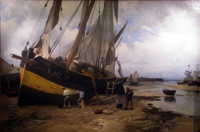 représentation du calfatage d'une coque à marée basse opéré par 3 ouvriers (l'un prépare le brai, tandis que les deux autres l'appliquent)