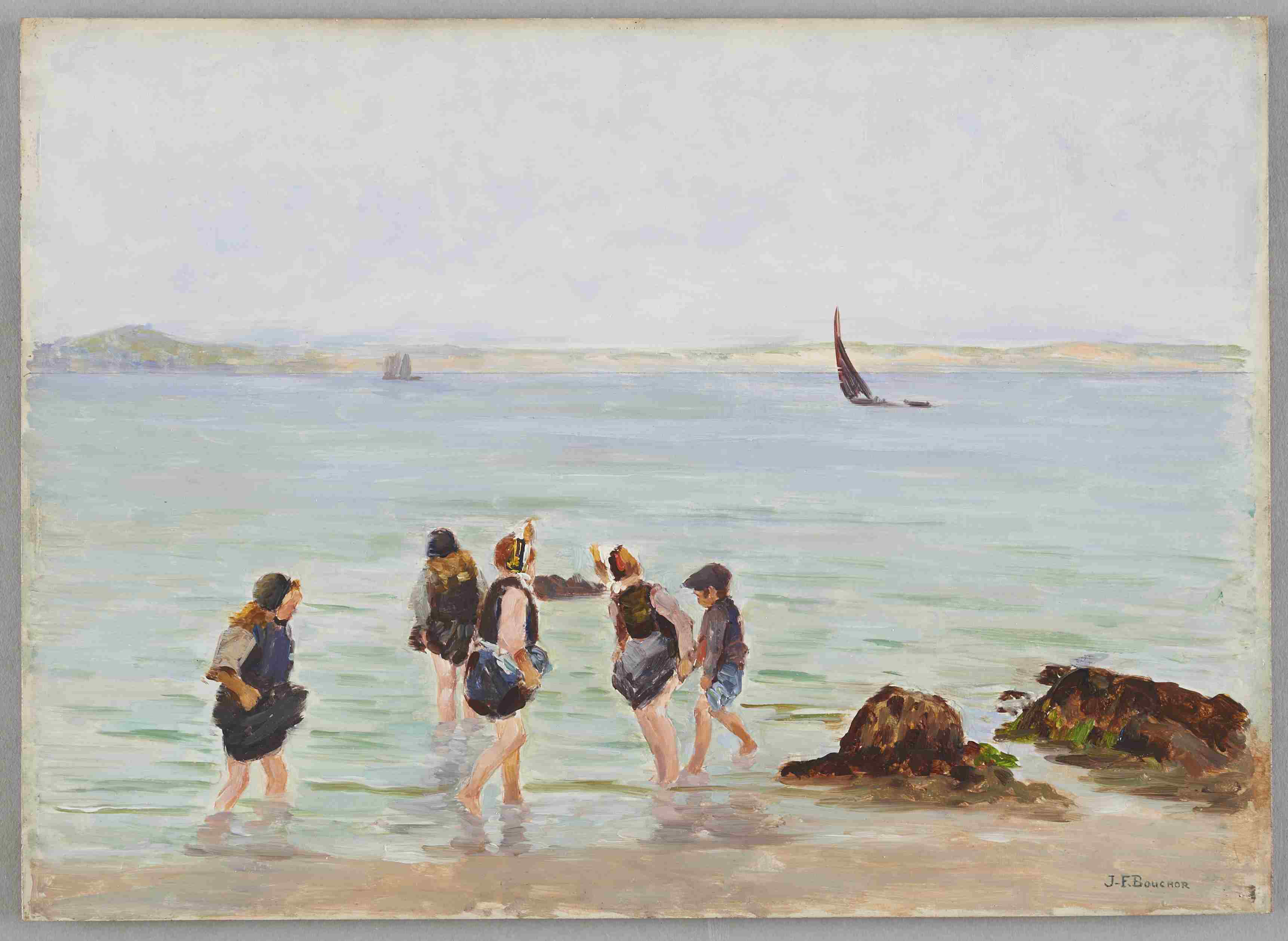 Signature b.d : J. F. Bouchor ; Etiquette h.m. au revers du panneau de bois, étiquette en grande partie arrachée, illisible ; Inscription m.m. imprimé au revers du panneau de bois : 4 ; Numérotation h.g. au stylo, au revers du panneau de bois : 334 ; Inscription h.g. imprimé au revers du panneau de bois : MUSEE DE LIMUR VANNES ; Tampon m.m. tampon imprimé au revers du panneau de vois, en partie effacé et illisible : Blanchet -38- Paris ; Inscription b.m. au crayon rouge : 2