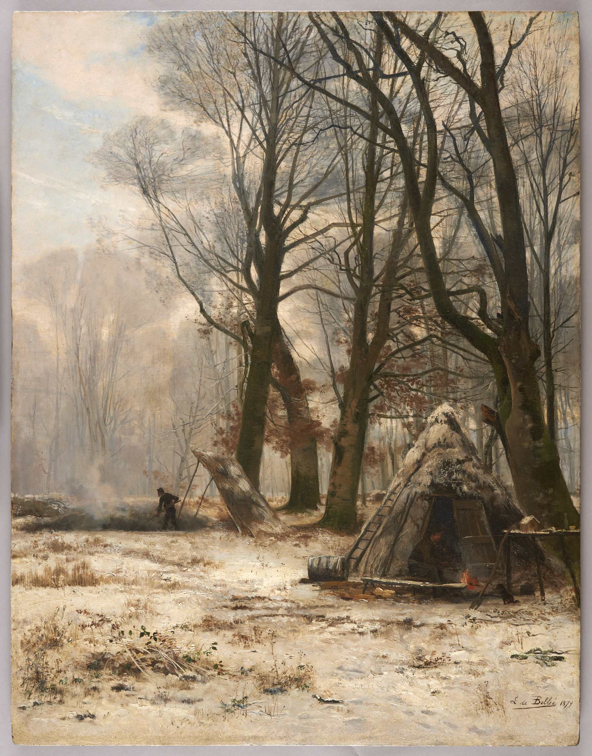 Signature b.d. : L. de Bellée ; Datation b.d : 1879 ; Inscription revers du cadre : Hutte de charbonnier - sous la nichelette four de campagne -...à la fontaine huit -...au carrefour Antoinette et précisions au sujet de la caisse et du transport de l'oeuvre au salon. ; Inscription cartel sur le cadre : L DE BELLEE donné par l'Etat 1880