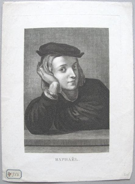 Gravure d'un jeune homme d'après le portrait de jeune homme conservé au Louvre, attribué d'abord à Raphaël puis à Parmigianino et plus récemment au Corrège.