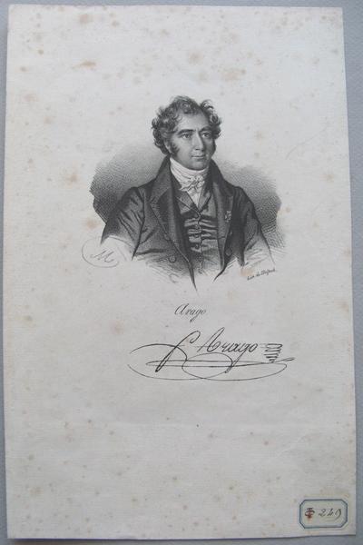 titre : Arago ; signé : M , Lith. de Delpech. ; signature en caractères typographiques : F. Arago ; numéro d'inventaire ancien, recto, étiquette : phi 249 ; numéro d'inventaire ancien, verso, manuscrit : 77.262 ; numéro d'inventaire : 2011.0.210