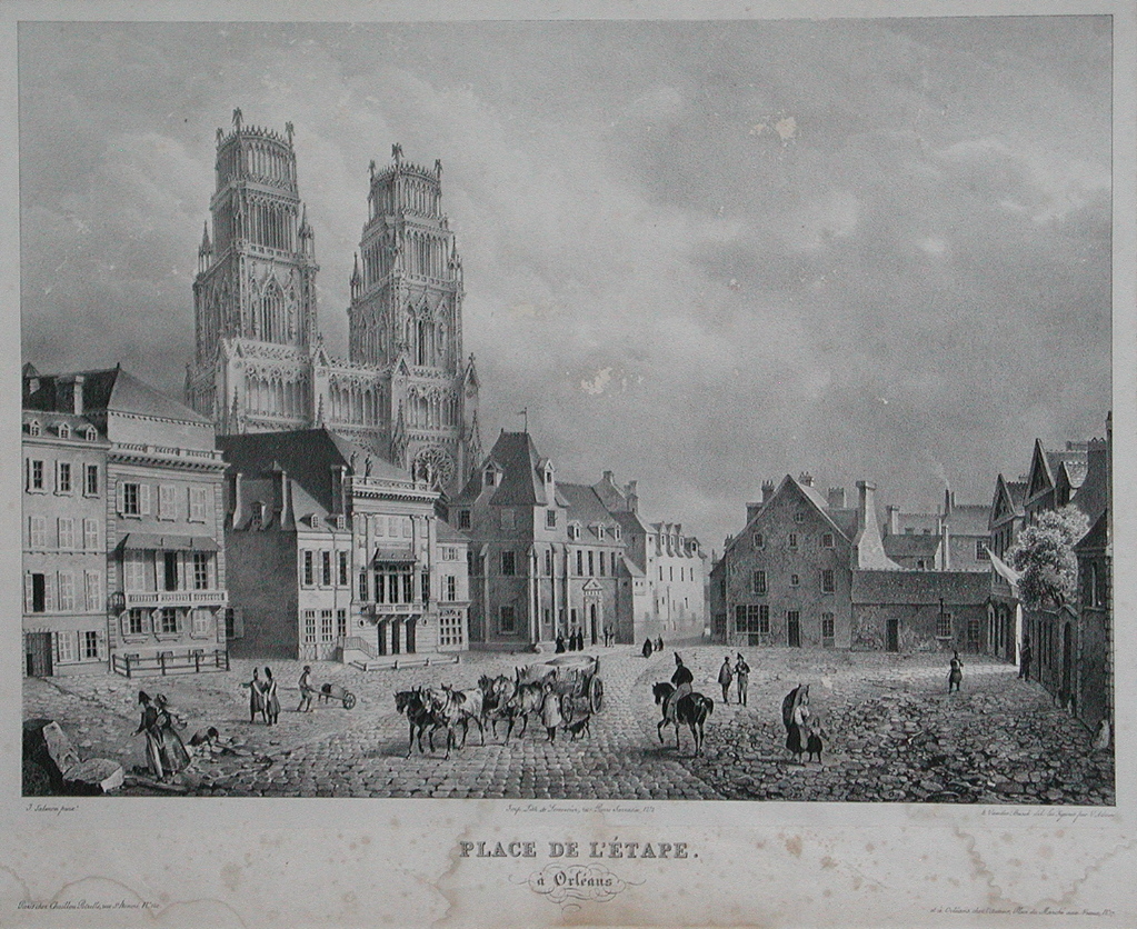 J. Salmon pinxt (S.b.g.) ; Imp. Lith de Lemercier, rue Pierre Sarrasin, N°2 (S.b.m.) ; H. Vander-Burch del les Figures par V. Adam (S.b.d.) ; Paris chez Chaillou Potrelle, rue St Honoré, N°140 (b.g., feuille support) ; et à Orléans, chez l’auteur, Place du Marché aux Neaux, N°17 (b.d., feuille support) ; Place de l’Etape. / à Orléans (b.m., feuille ssupport)