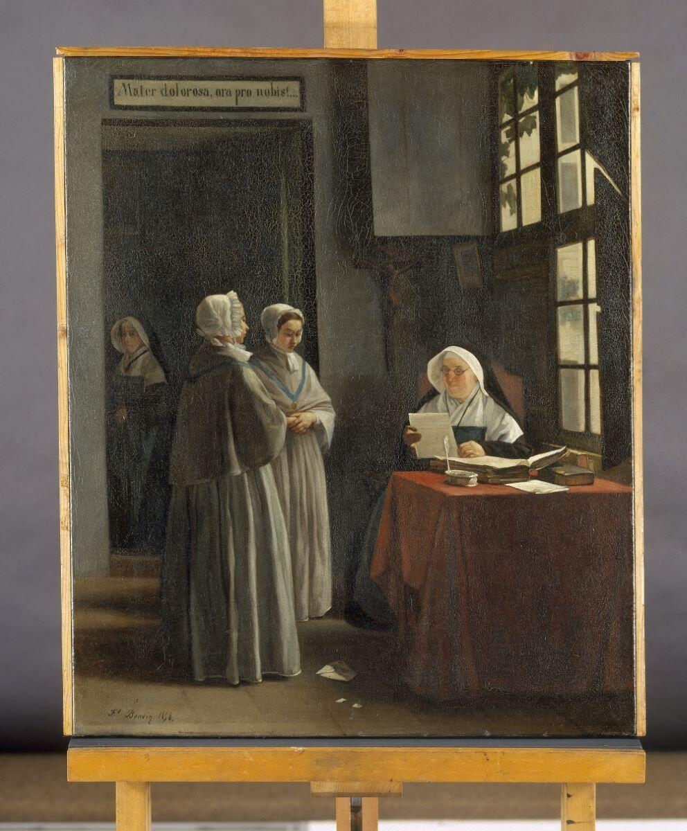 Dans le parloir d’un couvent, la supérieure lit la lettre que deux jeunes filles viennent de lui apporter; une nonne curieuse est au second plan ; un morceau de l’enveloppe déchirée est tombé à terre.