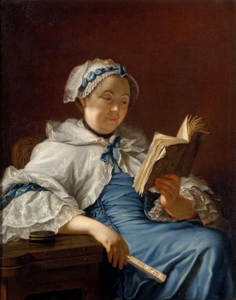 portrait (Nonnotte Marie Elisabeth, femme, de trois-quarts, assis, fauteuil, robe, dentelle, bonnet, éventail, meuble : table, tabatière, lecture : livre)