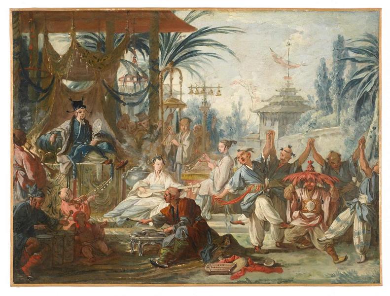 cette esquisse peinte fait partie d'une suite de peintures à sujet chinois commandée par Oudry(1686-1755), alors directeur de la manufacture de Beauvais, pour servir de cartons de tapisseries.