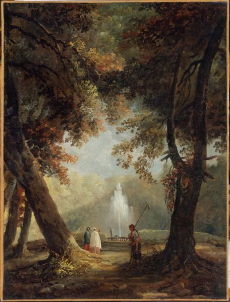 paysage (Frascati, jardin, arbre : feuillu, personnage, fontaine, jet d'eau)