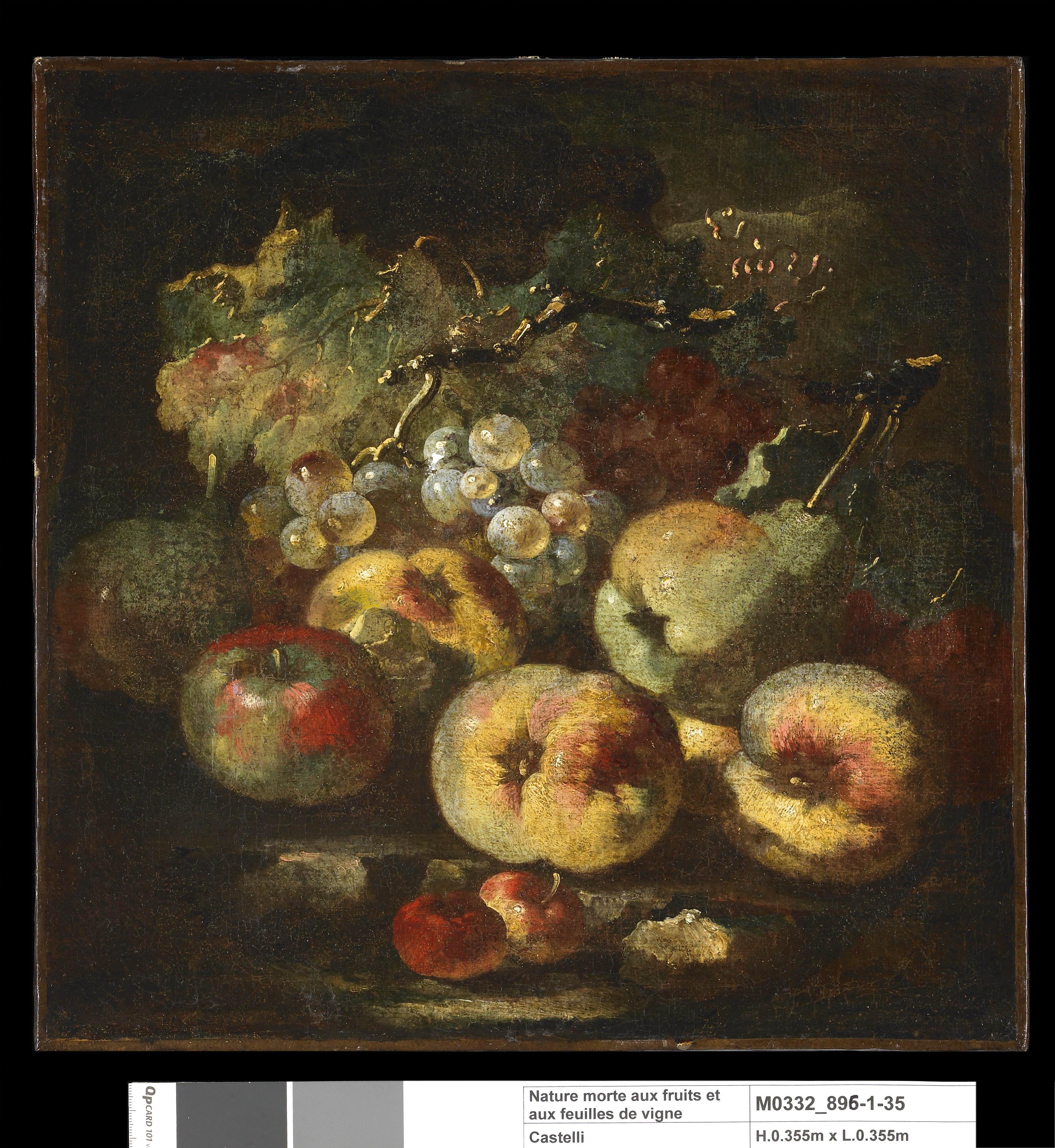 La présentation animée des fruits aux formes exubérantes, les forts contrastes de lumière et d’ombre et le coloris vif sont caractéristiques de Spadino. [...] Egalement caractéristiques la facture libre et savoureuse, ces rehauts posés du haut du pinceau qui soulignent les reflets des fruits, le dessin sinueux des nervures et des tiges, la découpe capricieuse des feuilles, et jusqu’à la façon d’insister sur la terminaison des vignes, dont les vrilles capricieuses se retrouvent dans toutes les compositions de Spadino et constituent à elles seules presque une signature. Soulignons le format réduit des deux toiles de Besançon - destinées à recevoir de petits cadres circulaires et à former sans doute une série plus importante. [...] “Divertissements picturaux " [...] le plaisir des amateurs, ces deux tableaux sont un parfait exemple de ce goût pour la matière, la couleur, qu'atteste toute la littérature artistique de l'époque et qui prélude dans les dernières décennies du XVIIe siècle et au tout début du XVIIIe siècle aux fantaisies de Guardi comme aux exercices plus libres de peintres comme Elisabeta Marchioni ou Marguerita Caffi.[...] (in BREJON de LAVERGNÉE Arnauld (sous la dir. de), “Peintures napolitaines du Musée des Beaux-Arts et d’Archéologie de Besançon”, 1986, p.28-29, notice par Alain BIGEARD)