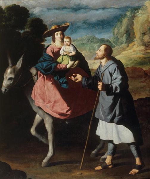 Cette Fuite en Egypte pourrait provenir d'un retable commandé en 1629 à Zurbaran pour l'un des autels collatéraux de l'église du couvent de la Trinidad Calzada de Séville [...] ce retable [...] devait rassembler quelque huit peintures [...]. On a montré comment Zurbaràn, dans un esprit de sobriété bien conforme à celui de la Contre-Réforme, a suivi presque à la lettre les indications iconographiques du théoricien sévillan Francisco Pacheco (1564-1654) [...]. La toile de Besançon n'est pas unanimement acceptée par la critique comme une oeuvre du maître et certains préfèrent y voir l'intervention de son atelier. (in PINETTE Matthieu et SOULIER-FRANCOIS Françoise, De Bellini à Bonnard, Paris, Pierre Zech Editeur, 1992, p.74)