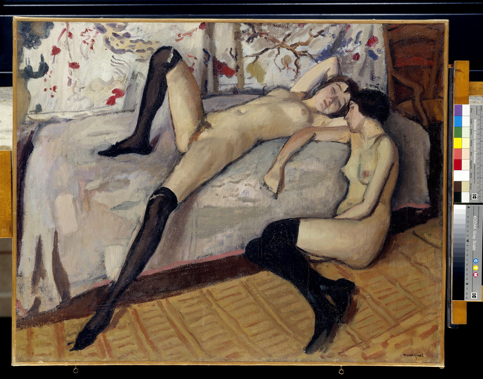 Ce tableau n'a pas été acheté directement à l'artiste, mais en vente publique à l'Hôtel Drouot à Paris le 8 décembre 1928 par George Besson, qui voulait sans doute avoir dans sa collection ce très bel exemplaire d'un sujet qui n'est pas si fréquent dans l'oeuvre d'Albert Marquet [...]. Il est bien certain que l'artiste entend mettre en évidence la surface de la toile et non le creusement de l'espace, en opposition avec une représentation illusionniste de la profondeur. On ne peut s'empêcher d'établir un parallèle entre ce procédé novateur en 1912 et la gêne provoquée par le sujet. (in PINETTE Matthieu et SOULIER-FRANCOIS Françoise, De Bellini à Bonnard, Paris, Pierre Zech Editeur, 1992, p.208)