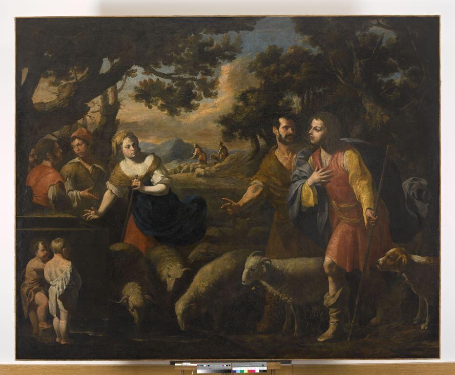 L'histoire empruntée aux chapitre 29-31 de la Genèse est un de ces récits bibliques fait pour séduire, par son mélange de quotidien et de merveilleux, les gens du XVIIe siècle; Jacob, arrivé chez son oncle Laban qui l'embauche pour garder ses troupeaux, s'engage à le servir sept années pour épouser sa seconde fille Rachel qui était belle et dont il était amoureux. Mais Laban lui substitue sa fille aînée Léa qui avait les yeux chassieux et Jacob dut le servir sept années de plus pour obtenir la main de la cadette. La présence de troupeaux était faite pour plaire à Beltrano, car il aimait peindre les animaux.