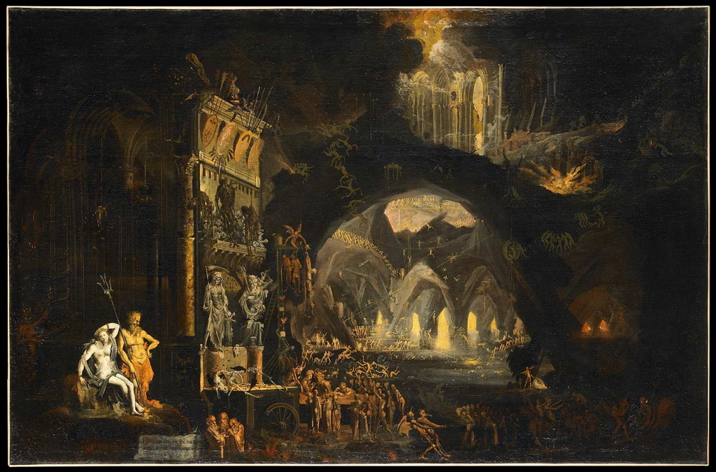 Le tableau nous emmène dans le monde infernal. Sur la gauche, Pluton contemple son empire des ténèbres, accompagné de son épouse Proserpine. A leurs pieds, un cartiglio : “Hélas pour moi en enfer il n’y a point de salut”. En bas, à droite, sur le Styx glauque, accoste la barque de Charon remplie de damnés que deux monstres entraînent déjà ; un peu plus en arrière apparaît Cerbère, le terrible molosse tricéphale qu’Hercule tente d’apprivoiser. En bas au centre, des malheureux se pressent autour d’une table où des mages semblent examiner les conditions de leur entrée dans le monde chtonien ; la scène est surmontée d’un long gibet d’oû pendent quatre cadavres. Sur la gauche s’élève une construction étrange, sans doute l’un de ces chars jadis construits pour célébrer certains triomphes ; la charogne d’un équidé, un ossuaire de crânes, des momies désarticulées s’y accumulent ; sur des colonnes se dressent les statues de la Mort et du Temps (Chronos dévorant un enfant) ; l’élévation s’achève par un trophée guerrier, symbole - devenu dérisoire - de la victoire terrestre. L’architecture du lieu, éclairée par des brasiers, tendue d’échelles et de cordes, exhale ponctuellement vapeurs et fumerolles ; d’immenses cavernes aux perspectives infinies débouchant sur des fournaises à de hautes nefs gothiques. La foule grouillante des damnés envahit cet univers impressionnant.