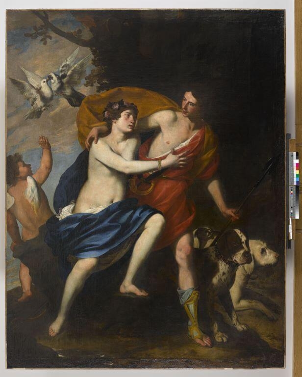Scène mythologique (Vénus, Adonis, nudité, drapé, chien , putto, colombe, couronne de fleur)