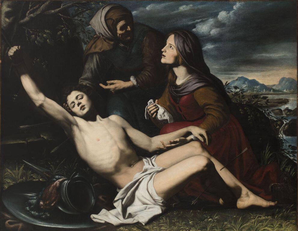 Le sujet de cette toile est le premier martyre de saint Sébastien [...]. Notre toile témoigne de la fortune particulière qu'à connu le sujet en Italie au XVII° siècle, notamment dans les milieux caravagesques. L'attribution du tableau à Palumbo [...] ne fait pas l'unanimité parmi les spécialistes. Il est en revanche bien établi que nous sommes ici en présence d'une oeuvre napolitaine du milieu du XVIIe siècle [...]. Notre tableau se situe parfaitement dans ce retour à l'ordre classique [...], il développe dans des couleurs lumineuses une élégances des attitudes, un lyrisme dans l'expression des sentiments, une douceur naturelle [...] qui sont autant de caractérisques de ce courant. (in PINETTE Matthieu et SOULIER-FRANCOIS Françoise, De Bellini à Bonnard, Paris, Pierre Zech Editeur, 1992, p.82)