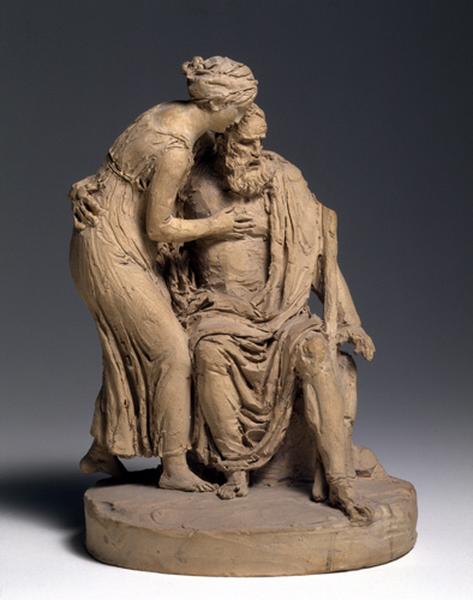 OUdipe, vieillard aveugle, assis, enlace la taille de sa fille qui se tient debout penchée vers lui; la main droite de la jeune fille repose sur la poitrine du vieil homme