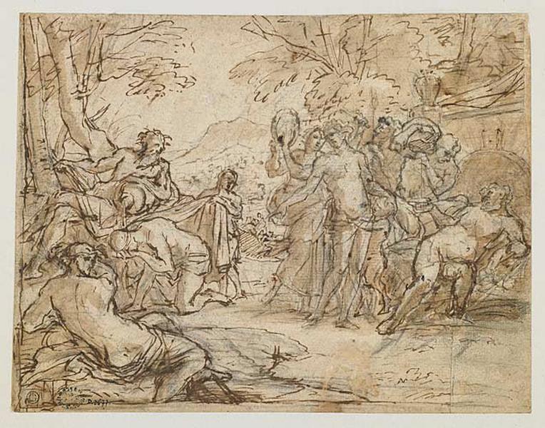 scène mythologique (Bacchus, groupe de figures, Midas, source)
