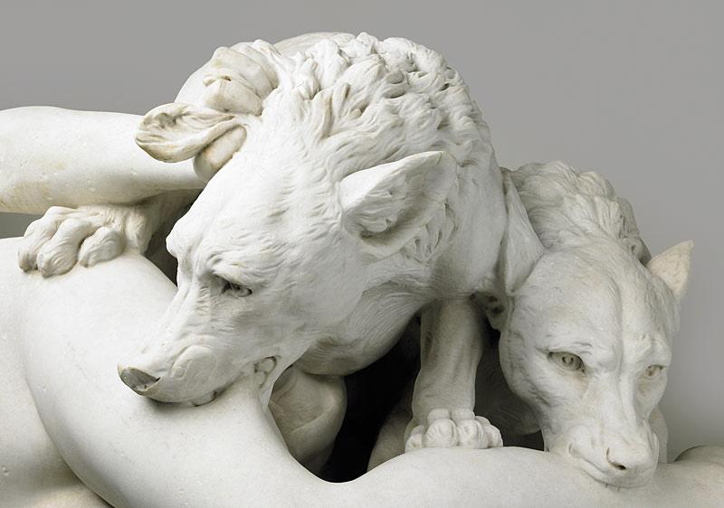 personnage féminin jeune, nu, allongé, attaqué et mordu par deux chiens; une main crispée sur l'oreille de l'animal et l'autre sur un drapé au sol.