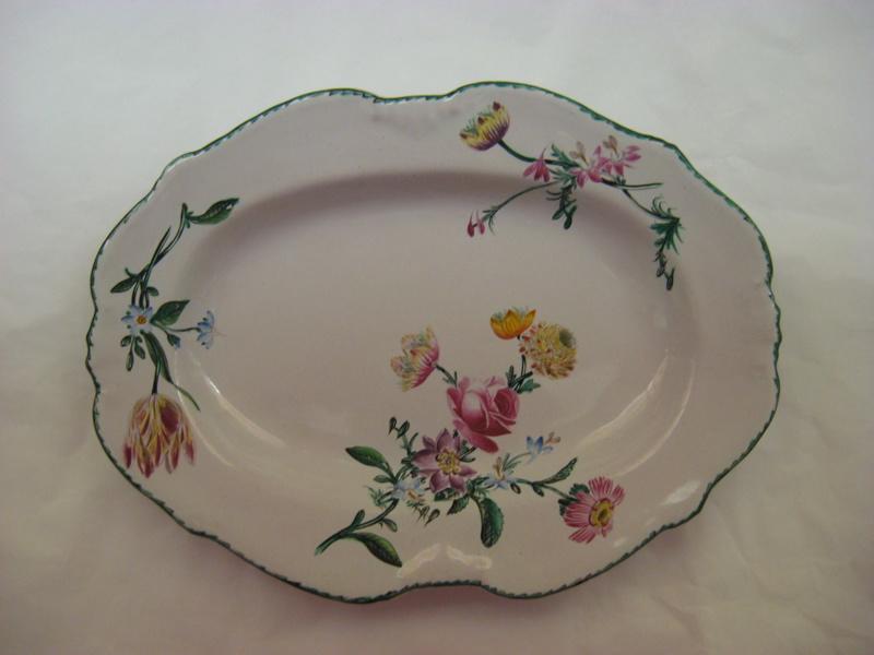 plat en faïence de petit feu, aile à bord lobé à liseré vert en dents de loup, décor de qualité fine et revers : émail blanc monochrome