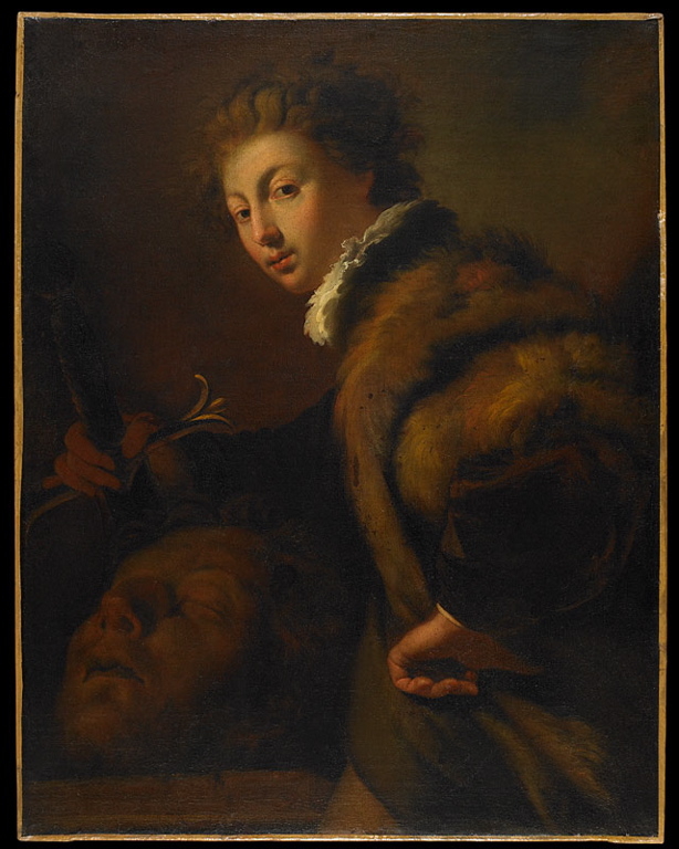 scène biblique (David : jeune homme, de trois-quarts, manteau : fourrure, épée, Goliath : tête, géant)