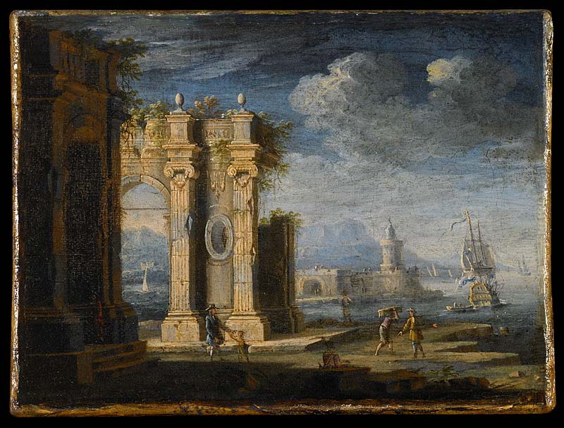 Dans le catalogue des peintures napolitaines de Besançon, ces deux vues de fantaisies [...] peuvent être rapprochées des deux Ruines (Tours, musée des Beaux-arts) que Boris Lossky, ancien conservateur de ce musée, attribue sur les conseils de Raffaello Causa, à la manière de Greco. L’écriture un peu timide et répétitive, l’aspect « imagerie » des deux œuvres de Besançon correspondent mieux au style de Greco. La tendance visionnaire, le style déchiqueté, luministe qui caractérisent d’habitude les vedute de Coccorante sont absentes de ces deux petits paysages de fantaisie” (in BREJON de LAVERGNÉE Arnauld (sous la dir. de), “Peintures napolitaines du Musée des Beaux-Arts et d’Archéologie de Besançon”, 1986, p.40-41, notice par A. BREJON de LAVERGNÉE )