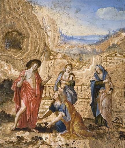 scène biblique (Christ, résurrection, apparition, sainte Madeleine, sainte Marie Cléophas, sainte Marie Salomé, ange) ; fond de paysage (grotte, montagne, temple, feuillu)