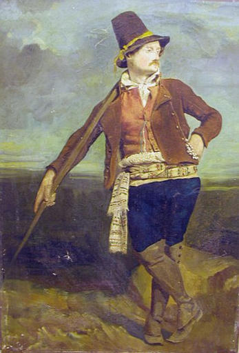 portrait (jeune homme, en pied, chapeau, costume traditionnel : Napolitain) ; fond de paysage