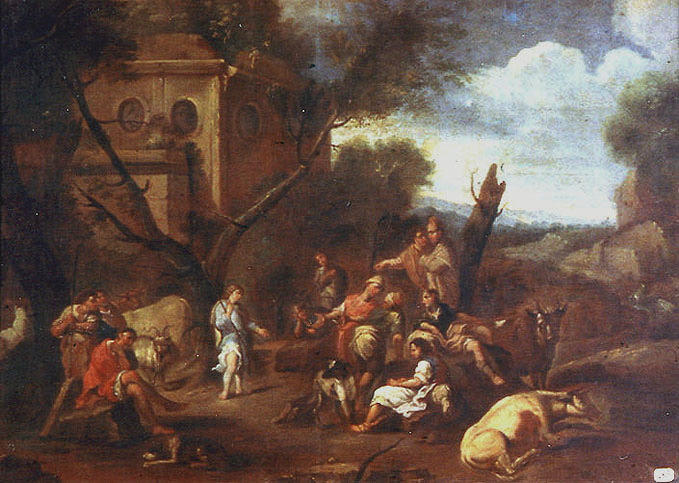 scène (berger, bélier, chien, vache) ; fond de paysage (arbre, colline, architecture, ruines)