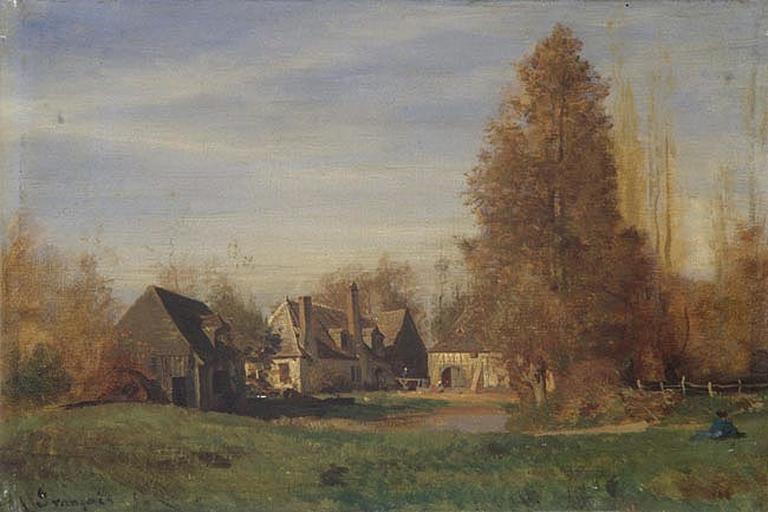 vue d'architecture (ferme, cour) ; paysage (mare, arbre, homme, allongé)