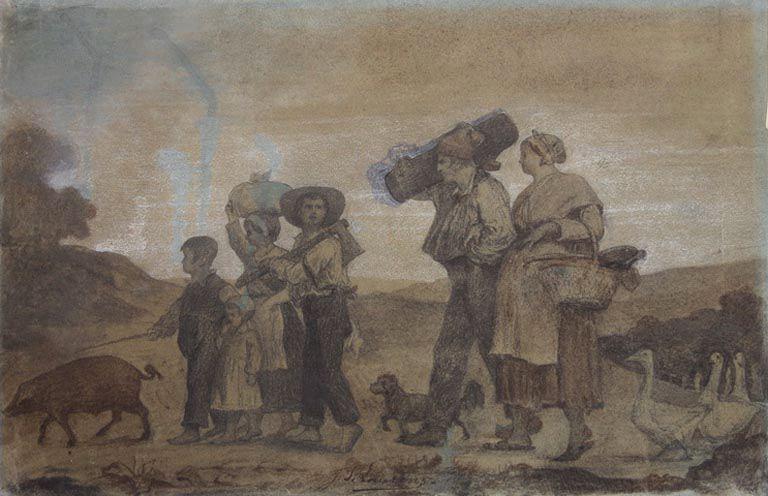 scène (homme, femme, enfant, paysan, marché, chien, cochon, oie) ; fond de paysage (colline, arbre)