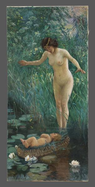 La fille de pharaon, debout, les pieds dans l'eau, découvre le petit Moïse dormant dans un couffin flottant sur l'eau. Les formes se reflètent dans l'eau sur laquelle flottent des nénuphars. Une végétation luxuriante caractérise l'arrière-plan.