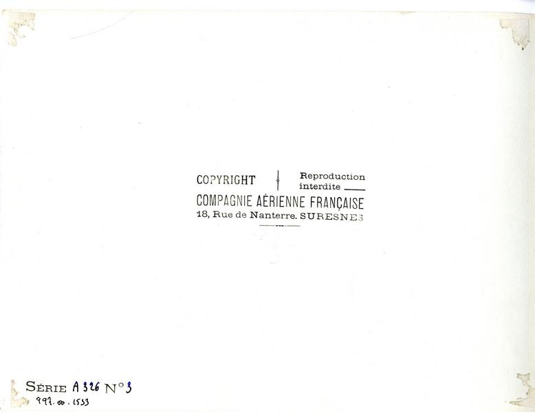 COPYRIGHT / Reproduction interdite COMPAGNIE AERIENNE FRANCAISE 18, Rue de Nanterre SURESNES / SERIE A326 N° 3 (verso, tampon à l'encre et à l'encre bleue) ; 997.00.1533 (verso, angle inférieur gauche, à l'encre bleue)