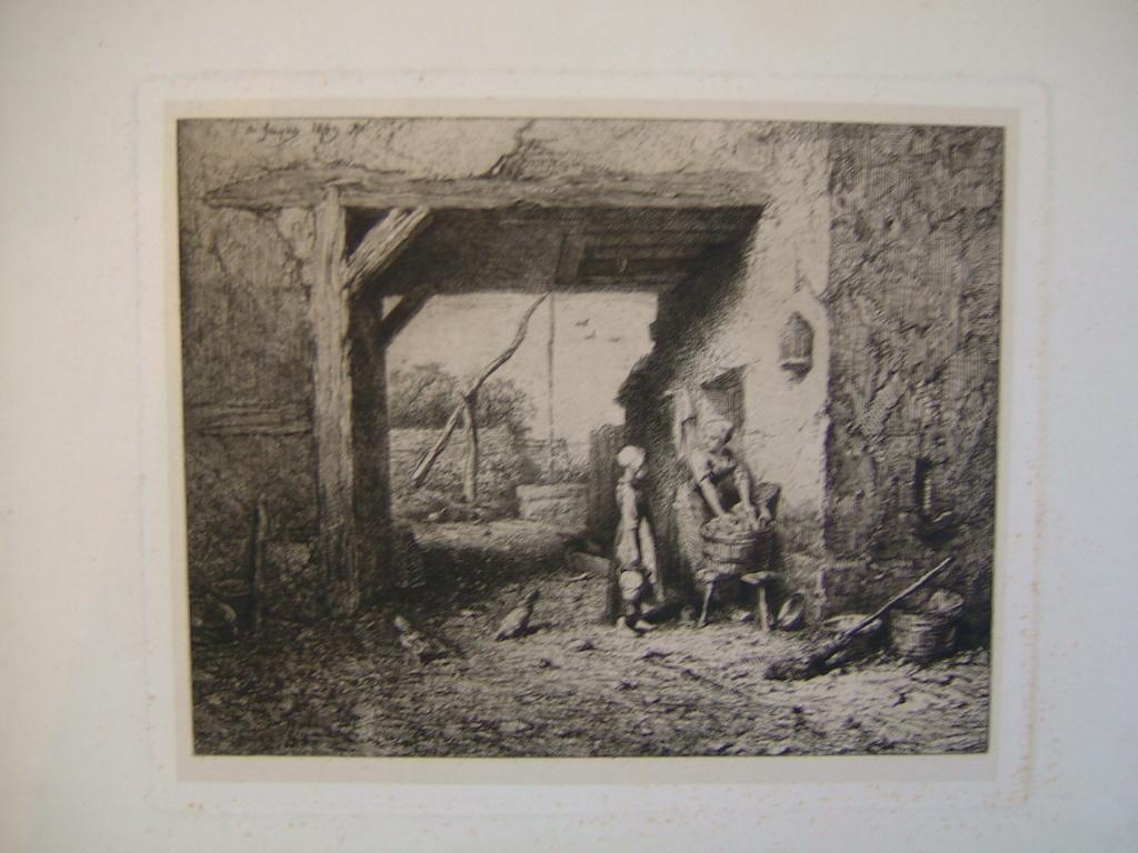 scène (femme, fillette, ferme, lessive, cour, poule)