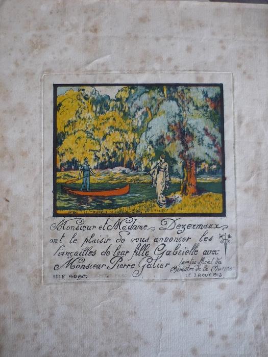 Monsieur et Madame Dezermaux ont le plaisir de vous annoncer les fiançailles de leur fille Gabrielle avec Monsieur Pierre Gatier; peintre officiel de la Marine; L'Isle-Adam 3 août 1913