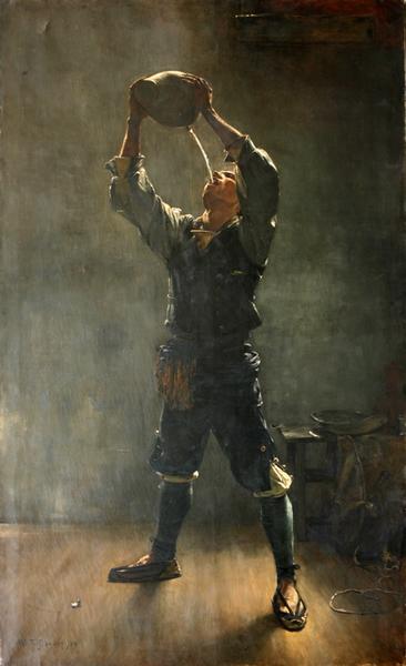 debout, au milieu du tableau, la face un peu tournée à gauche, le contrebandier boit avidement l'eau d'une cruche qu'il élève entre ses deux mains.
