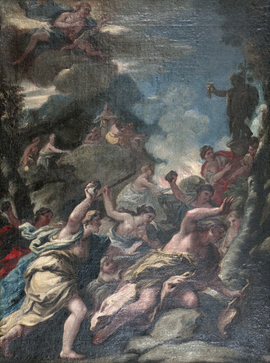 ?otice d'Alain Roy dans le catalogue 'les métamorphoses d'Orphée' : 'la scène illustre le début de la 11° métamorphose d'Ovide (vers 1 à 43). Cette belle esquisse est décrite par O. Ferrari comme 'une oeuvre de Giordano avec la collaboration de l'atelier' et est datée de 1697 environ. Cette date correspond à la fin de la carrière de l'artiste : les formes deviennent de plus en plus fluides et toute la composition est rythmée d'obliques qui accentuent son caractère éminemment dynamique. Le coloris lui-même s'apaise pour atteindre une délicate harmonie d'ensemble qui nous entraîne dans un monde qui appartient déjà plus au rococo qu'au baroque. Dans cette belle oeuvre, à la touche libre et rapide, Luca Giordano mérite bien le surnom de 'fa presto' que ses contemporains lui ont donné.'