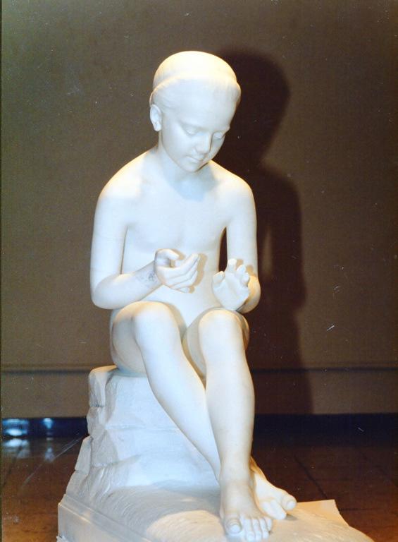 Une jeune fille nue au corps gracile, assise ; elle tient dans ses mains un petit escargot qu’elle regarde avec attention ; ses cheveux, tirés en arrière et retenus par un ruban, sont coiffés en chignon.
