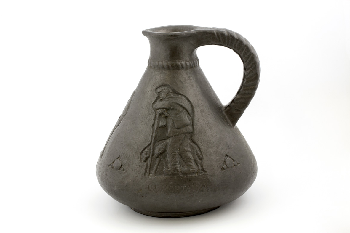 Une cruche en terre cuite noire patinée ; panse large et bombée, ornée de figures humaines - des paysans au travail, un homme à la bêche ; col étroit ; anse décorée.