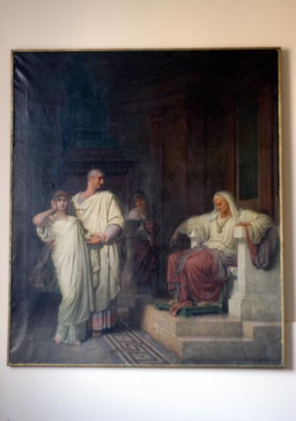 Histoire romaine; Dans un temple antique, une vestale est présentée par un prêtre à l'empereur Galba, assis sur un trône à droite.