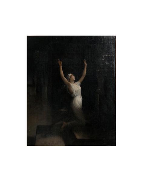 Histoire romaine : Vestale agenouillée devant un autel, les bras levés.